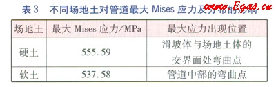 計算兩種情況下管道的最大應力及其位置(見表3),當場地土較硬時最大應力出現(xiàn)在滑坡體與場地土體交界處,即在A點和B點的彎曲作用明顯;而當場地土較軟時管道最大Mises應力稍小一些,且最大應力出現(xiàn)在管道的中部,即較軟的場地土可以使管道產(chǎn)生更大范圍的橫向位移,一定程度上緩解了彎曲應力,反而使其最大Mises應力有所降低。