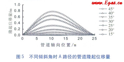 不同滑坡傾斜角時管道隆起位移量見圖5。管道的隆起位移量隨著傾斜角的增大而增加,但最大隆起位移量始終位于管道中下部,這與管道下方所受土體壓力較大有關(guān)。