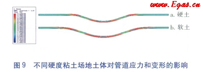 為分析滑坡兩側(cè)場地土體的影響,以滑坡規(guī)模20m為例,其他計算參數(shù)不變,分別計算硬土和軟土條件下管道的受力情況,硬土和軟土的剪切強度分別取50kPa和35kPa,如圖9所示,當場地土體為軟土(圖9-b)時管道橫向位移發(fā)生范圍較長。