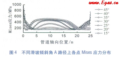 將滑坡規(guī)模固定為25m,滑坡傾斜角分別為15°、20°、25°、30°、35°、40°和45°,A路徑上各點的Mises應力值見圖4。不同傾斜角下,管道的應力集中區(qū)均為管道兩端和中下部。但隨著滑坡傾斜角的增加,管道的三個應力集中區(qū)范圍逐漸增大,特別是管道中段的應力集中區(qū)向兩端延伸,且最大應力值也隨之增加。