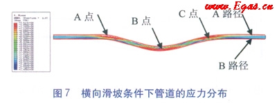 模型中滑坡體取粘土,土體剪切強度為50kPa,滑坡傾斜角為30°,滑坡規(guī)模為15m,滑坡兩側(cè)場地土各取20m。以輸油管道為計算對象,管道外徑為711mm,壁厚為10.3mm,管道材質(zhì)為X70鋼,管道內(nèi)壓為8MPa,管道埋深1.8m,管—土摩擦系數(shù)為0.65。在ABAQUS軟件中繪制出管道的Mises應力云圖(見圖7,單位為MPa),管道共存在三個應力集中區(qū)域(A點、B點和C點),即管道中部和滑坡體與兩側(cè)場地土分界面處的兩個彎曲區(qū)域,但管段彎曲方向內(nèi)外兩側(cè)由于拉壓應力和彎曲應力組合而有所不同,沿管道軸向根據(jù)滑坡移動方向在管道兩側(cè)選擇A路徑和B路徑為分析對象。
