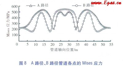 繪制出A路徑和B路徑上管道的Mises應力分布曲線(見圖8),拉壓應力和彎曲應力的組合使得管道部分彎曲區(qū)域形成最小應力區(qū)。