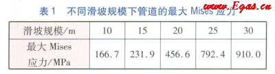 將滑坡傾斜角固定為30°,滑坡規(guī)模分別為10m、15m、20m、25m和30m,得出管道上最大Mises應力值如表1所示,隨著滑坡規(guī)模的擴大,管道上的最大Mises應力迅速增大。