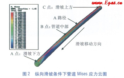 模型中滑坡體取粘土,土體剪切強度為50kPa,滑坡傾斜角為30°,滑坡規(guī)模為25m。以輸油管道為例,管道外徑為711mm,壁厚為10.3mm,管道材質(zhì)為X70鋼,管道內(nèi)壓8MPa,管道埋深1.8m,管—土間的摩擦系數(shù)為0.65。在ABAQUS軟件中繪制出管道的Mises應力云圖(見圖2,單位為MPa),并沿管道軸向在管道上取A點、B點、C點和經(jīng)過以上三點的A路徑為參考位置和分析對象。