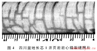 上揚(yáng)子地區(qū)除四川盆地外,其余地區(qū)勘探程度非常低,且無(wú)論是四川盆地還是四川盆地以外的探區(qū),已往的油氣勘探實(shí)踐中,都沒(méi)有把頁(yè)巖地層當(dāng)做有效目的儲(chǔ)層對(duì)待。因此,開展頁(yè)巖儲(chǔ)層的研究甚少[3~4]。四川盆地長(zhǎng)寧構(gòu)造所鉆的長(zhǎng)芯1井8個(gè)志留系頁(yè)巖樣品的巖礦組成分析結(jié)果見表1。長(zhǎng)寧構(gòu)造龍馬溪組頁(yè)巖巖礦組成中,黏土最多,含量為26.5%~59.5%,平均48.25%,其次是石英,含量為20.5%~29.7%,平均25.3%,方解石含量為4.1%~26.9%,平均12.4%。與美國(guó)已知含氣頁(yè)巖相比,該井硅質(zhì)(石英)含量偏少,而黏土(伊利石為主)含量偏高,根據(jù)美國(guó)經(jīng)驗(yàn),這似乎對(duì)頁(yè)巖儲(chǔ)層的脆性有影響。但仔細(xì)分析發(fā)現(xiàn),該井的方解石總量較高,石英和方解石總量達(dá)37%,表明該套頁(yè)巖具有脆性巖石組分。野外剖面可見風(fēng)化破碎的龍馬溪組筆石頁(yè)巖,且在露頭和長(zhǎng)芯1井巖心上均可發(fā)現(xiàn)頁(yè)巖高角度縫和微裂縫十分發(fā)育(圖4),揭示了該區(qū)頁(yè)巖具有良好的脆性特征。