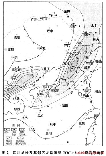 圖2是四川盆地及其鄰區(qū)下志留統(tǒng)龍馬溪組TOC>2.0%的黑色頁(yè)巖累計(jì)厚度分布圖。由圖2可見,龍馬溪組TOC>2.0%高值區(qū)分布于川東石柱-鄂西利川,黑色頁(yè)巖厚達(dá)100m,川北鎮(zhèn)巴黑色頁(yè)巖厚20m,川南瀘州一帶厚60~80m。3個(gè)高值區(qū)的分布在地質(zhì)上和川東-鄂西深水陸棚沉積相帶、川北深水陸棚沉積相帶以及川南深水陸棚沉積相帶分布相吻合。