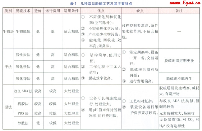 脫硫工藝一般可劃分為3類:生物法、干法、濕法。多數(shù)情況下,單項(xiàng)脫硫工藝很難完全滿足要求,通常需要采用組合工藝,例如生物法進(jìn)行粗凈化,吸附法(干法)進(jìn)行深度凈化。表1列舉了常見的幾種脫硫工藝及其主要特點(diǎn)[2]。