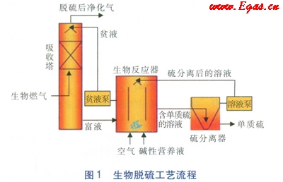 生物燃?xì)庥晌账撞窟M(jìn)入,貧液泵將生物反應(yīng)器中貧液(堿性營(yíng)養(yǎng)吸收液)打入吸收塔頂,兩者在塔內(nèi)逆向接觸反應(yīng),生物燃?xì)庵械?/span>H2S被貧液吸收,成為含有大量H2S的富液;該富液自吸收塔底部進(jìn)入生物反應(yīng)器,生物反應(yīng)器內(nèi)裝填有微生物(各類硫桿菌等),在通入空氣環(huán)境下,富液中的H2S通過微生物的好氧反應(yīng)被氧化成單質(zhì)硫沉積于生物反應(yīng)器底部;這樣,富液得以再生為貧液,由貧液泵再次送入吸收塔,吸收生物燃?xì)庵械?/span>H2S。由此構(gòu)成“吸收一再生”循環(huán)過程。