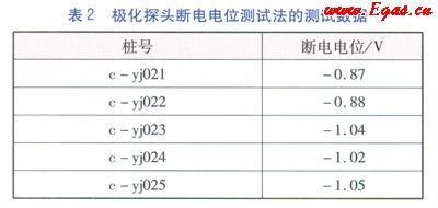 極化探頭[2]的極化試片在充分極化后,斷掉陰極保護電流,極化試片上的土壤IR降(陰極保護電流產生的IR降和雜散電流產生的IR降)瞬間等于零,在0.5s內讀取的數據為管道的斷電電位(測試數據見表2)。這樣不僅能消除陰極保護電流產生的IR降,還能消除雜散電流產生的IR降,能得到管道真實的陰極保護電位。本方法適用于受雜散電流干擾或無法同步中斷陰極保護電流的管道,尤其適用于犧牲陽極陰極保護的城鎮(zhèn)燃氣管道的測試。