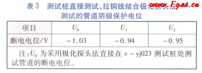 b.采用極化探頭法,在c-yj024測試樁上直接測試c-yj024測試樁處管道斷電電位U(測試方法見圖2),測試數據見表3,測試數據用來比對分析拉銅線結合極化探頭法的準確、可靠性。