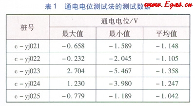 c.在c-yj023測試樁連接銅線,拉銅線到c-yj024測試樁附近,連接c-yj024測試樁附近的極化探頭,測得斷電電位%,極化探頭的埋設位置與在c-yj024測試樁直接測試斷電電位時埋設位置相同(測試方法見圖3),測試數據見表3。