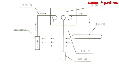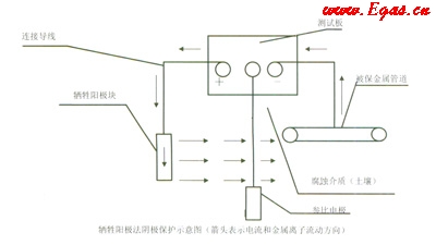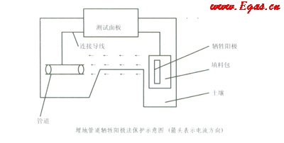 針對(duì)埋地管道電解化學(xué)腐蝕的過程和實(shí)際情況,我們應(yīng)從兩方面解決管道的防腐問題。一是加強(qiáng)管道的絕緣性:①管道第一層涂環(huán)氧粉末;②第二層涂聚乙烯(PE);③第三層涂EVA樹脂。增火回路電阻,減少腐蝕電流。二是用犧牲陽(yáng)極保護(hù)法,對(duì)管道進(jìn)行陰極保護(hù)。見示意圖: