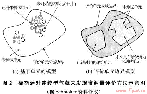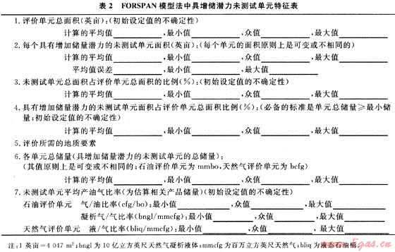 福斯潘模型(FORSPAN)法是USGS在1999年為連續(xù)型油氣藏資源評價而提出的一種評價方法。該方法以連續(xù)型油氣藏的每一個含油氣單位為對象進行資源評價,即假設(shè)每個單元都有油氣生產(chǎn)能力,但各單元間汗油氣性(包括經(jīng)濟性)可以相差很大,以概率形式對每個單元的資源潛力作出預測。以往也用體積法對連續(xù)型油氣藏資源潛力作過評價。在體積法中,原始資源量估算常用的參數(shù)主要是一些基本地質(zhì)參數(shù)(如面積、厚度、孔隙度等),這些參數(shù)有很大的不確定性,且各單元間關(guān)系密切、缺乏獨立性。因此,參數(shù)選取及標準確定較困難。福斯潘(FORSPAN)法建立在已有開發(fā)數(shù)據(jù)基礎(chǔ)上(圖2),估算結(jié)果為未開發(fā)原始資源量。因此,該方法適合于已開發(fā)單元的剩余資源潛力預測。已有的鉆井資料主要用于儲層參數(shù)(如厚度、含水飽和度、孔隙度、滲透率)的綜合模擬、權(quán)重系數(shù)的確定、最終儲量和采收率的估算。如果缺乏足夠的鉆井和生產(chǎn)數(shù)據(jù),評價可依賴各參數(shù)的類比取值。