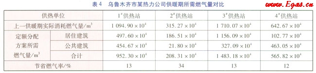 按照定額分配方案,將供暖熱負(fù)荷指標(biāo)代入上述公式,計(jì)算出不同室外溫度下單位時(shí)間所需燃?xì)饬?,進(jìn)而推算出在烏魯木齊的氣象條件下,各供熱單位在一個(gè)供暖期(183d)內(nèi)所需燃?xì)饬?,并與實(shí)際消耗燃?xì)饬窟M(jìn)行比較,比較結(jié)果見表4。