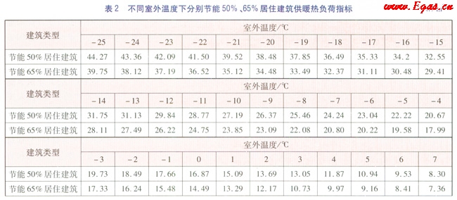 根據(jù)文獻(xiàn)[1]及GB 50736—2012《民用建筑供暖通風(fēng)與空氣調(diào)節(jié)設(shè)計(jì)規(guī)范》、JCJ 26—2010《嚴(yán)寒和寒冷地區(qū)民用建筑節(jié)能設(shè)計(jì)標(biāo)準(zhǔn)》、JGJ 26—5《民用建筑節(jié)能設(shè)計(jì)標(biāo)準(zhǔn)(供暖居住建筑部分)》規(guī)定的汁算參數(shù),以烏魯木齊市供熱區(qū)域內(nèi)某居住建筑為例,進(jìn)行能耗分析。該建筑坐北朝南,共6層,建筑高度為16.8m,總建筑面積為4112.64m2,體形系數(shù)為0.28。節(jié)能50%居住建筑外墻傳熱系數(shù)為0.43W/(m2·K),外窗的傳熱系數(shù)為2.47W/(m2·K);節(jié)能65%居住建筑外墻傳熱系數(shù)為0.35W/(m2·K),外窗傳熱系數(shù)為1.8W/(m2·K)。計(jì)算得出不同室外溫度(室外溫度取整數(shù))時(shí),該居住建筑分別節(jié)能65%、50%時(shí)的供暖熱負(fù)荷指標(biāo),計(jì)算結(jié)果見表2。當(dāng)室外溫度達(dá)到16℃時(shí),鍋爐停止供暖,熱負(fù)荷指標(biāo)為0,但由于烏魯木齊的晝夜溫差可逾20℃,因此存在白天停止供暖,傍晚及夜間又恢復(fù)供暖的情況。