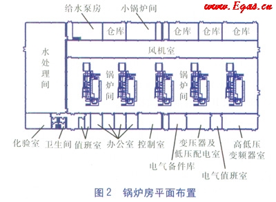 鍋爐房與變配電站、調(diào)壓站的相對(duì)位置見圖1,鍋爐房平面布置見圖2。
