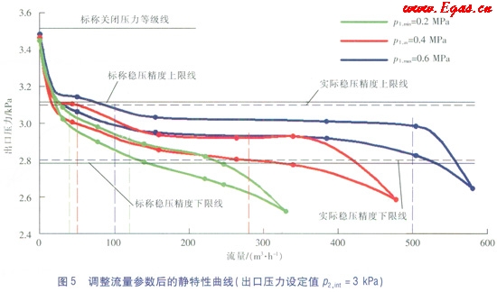 ②調(diào)壓器的靜特性與流量參數(shù)密切相關(guān):當(dāng)進(jìn)出口壓力范圍不變時(shí),在滿足標(biāo)稱關(guān)閉壓力等級(jí)、標(biāo)稱關(guān)閉壓力區(qū)等級(jí)和標(biāo)稱靜特性曲線族關(guān)閉壓力區(qū)等級(jí)的條件下,通過(guò)適度地調(diào)整流量參數(shù),有可能使調(diào)壓器達(dá)到更高的穩(wěn)壓精度等級(jí);通過(guò)降低標(biāo)稱穩(wěn)壓精度等級(jí)和(或)標(biāo)稱關(guān)閉壓力等級(jí),可以在一定程度上拓寬調(diào)壓器的適用流量范圍。上述參數(shù)的調(diào)整需要通過(guò)試驗(yàn)和作圖相結(jié)合的方法實(shí)現(xiàn)。
