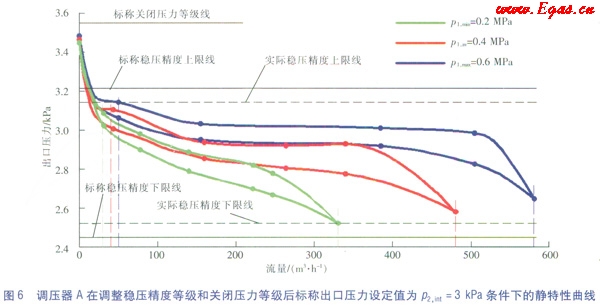 以標(biāo)稱出口壓力設(shè)定值p2,int=3kPa為例(調(diào)整參數(shù)后的靜特性曲線圖見(jiàn)圖5),調(diào)整流量參數(shù)后,調(diào)壓器A在標(biāo)稱出口壓力p2,int=3kPa條件下的實(shí)際穩(wěn)壓精度為Ac,a=4.97<5(圖5中的實(shí)際穩(wěn)壓精度等級(jí)線與標(biāo)稱穩(wěn)壓精度等級(jí)線幾乎重合,為了使圖線得以區(qū)分,圖5在繪制過(guò)程中進(jìn)行了適當(dāng)放大處理,將實(shí)際穩(wěn)壓精度等級(jí)線與標(biāo)稱穩(wěn)壓精度等級(jí)線的間距適當(dāng)加大);實(shí)際關(guān)閉壓力等級(jí)為Sg,a=17.31<20;三條靜特性曲線的實(shí)際關(guān)閉壓力區(qū)等級(jí)分別為:p1=0.2MPa時(shí)Sz,a=19.23<20,p1=0.4MPa時(shí)Sz,a=6.67<20,p1=0.6MPa時(shí)Sz,a=5.52<20;實(shí)際靜特性曲線族的關(guān)閉壓力區(qū)等級(jí)為Sz,p,a=19.78<20。