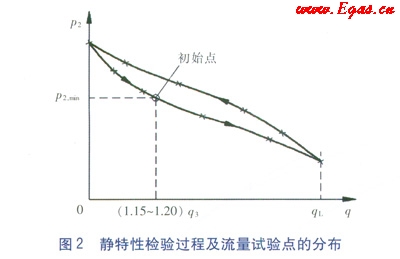 初始狀態(tài)設(shè)定完畢后的靜特性檢驗(yàn)過(guò)程及流量試驗(yàn)點(diǎn)的分布如圖2所示(以標(biāo)稱出口壓力設(shè)定值為p2,min為例)。