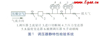 為了確保檢驗(yàn)過(guò)程的安全性,調(diào)壓器靜特性檢驗(yàn)的試驗(yàn)介質(zhì)采用壓縮空氣。調(diào)壓器靜特性檢驗(yàn)過(guò)程中,由調(diào)壓器1調(diào)節(jié)被測(cè)調(diào)壓器6的進(jìn)口壓力,由壓力變送器4測(cè)量被測(cè)調(diào)壓器6的進(jìn)口壓力值;通過(guò)手動(dòng)球閥9來(lái)調(diào)節(jié)通過(guò)被測(cè)調(diào)壓器6的壓縮空氣流量,流量值由流量計(jì)2測(cè)量,同時(shí)讀取由壓力變送器7測(cè)得的被測(cè)調(diào)壓器6實(shí)時(shí)的出口壓力值。在檢驗(yàn)過(guò)程中,進(jìn)口切斷閥3保持開(kāi)啟狀態(tài),檢驗(yàn)結(jié)束后關(guān)閉進(jìn)口切斷閥3。如果在檢驗(yàn)過(guò)程中出現(xiàn)異常,則關(guān)閉進(jìn)口切斷閥3,故障排除后再開(kāi)啟進(jìn)口切斷閥3繼續(xù)檢驗(yàn)。溫度變送器5和8測(cè)量被測(cè)調(diào)壓器6進(jìn)口和出口的壓縮空氣溫度。