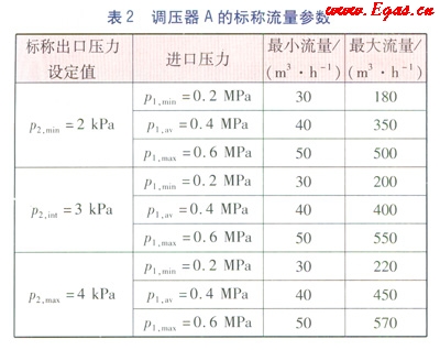 以一款直接作用式調(diào)壓器A為例,該調(diào)壓器的進(jìn)口壓力范圍為dp1=0.2~0.6MPa(即p1,min=0.2MPa,p1,max=0.6MPa),出口壓力范圍dp2=2~4kPa(即p2,min=2kPa,p2,max=4kPa)。其標(biāo)稱穩(wěn)壓精度等級(jí)Ac=10,標(biāo)稱關(guān)閉壓力等級(jí)Sg=20,標(biāo)稱關(guān)閉壓力區(qū)等級(jí)Sz=20,標(biāo)稱靜特性曲線族的關(guān)閉壓力區(qū)等級(jí)Sz,p=20。相應(yīng)的標(biāo)稱流量參數(shù)見(jiàn)表2。