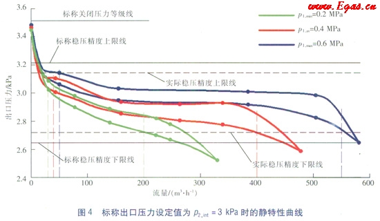 調(diào)壓器A在上述標(biāo)稱出口壓力設(shè)定值p2,int=3kPa參數(shù)條件下的靜特性曲線圖見(jiàn)圖4。