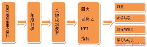 根據(jù)平衡計(jì)分卡管理思想,部門考核指標(biāo)應(yīng)該是由公司戰(zhàn)略目標(biāo)及年度董事會(huì)指標(biāo)進(jìn)行層層分析得到的,如下圖: