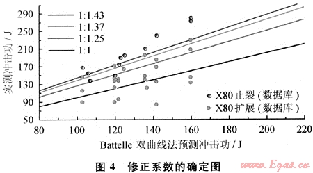 新頒布的ISO 3183 2007中給出了幾種常用的止裂韌性預(yù)測(cè)方法的適用范圍(見(jiàn)表2)??梢?jiàn),對(duì)于西二線,只有Battelle雙曲線法適用。ISO 3183—2007進(jìn)一步指出,當(dāng)預(yù)測(cè)結(jié)果大于100J時(shí),應(yīng)對(duì)預(yù)測(cè)結(jié)果進(jìn)行修正。而修正系數(shù)是由已經(jīng)進(jìn)行的全尺寸實(shí)物爆破試驗(yàn)結(jié)果確定的。由圖4得出西二線止裂韌性修正系數(shù)為1.43。幾種預(yù)測(cè)結(jié)果對(duì)比如表3所示。