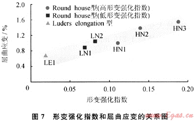鋼管在塑性變形過(guò)程中產(chǎn)生的形變強(qiáng)化,可以阻止進(jìn)一步變形的發(fā)生,防止變形的局部集中。這一過(guò)程可以通過(guò)形變強(qiáng)化指數(shù)表征。提高管材的形變強(qiáng)化指數(shù)是提高輸送管變形能力的有效途徑(圖7)[13~14]。對(duì)于具有較高變形能力的管線鋼,其形變強(qiáng)化指數(shù)一般大于0.1。