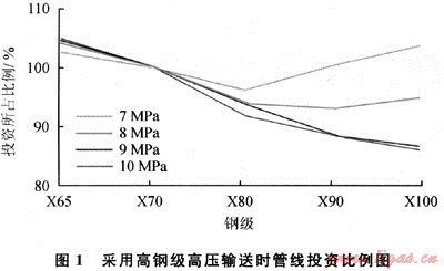 在日益激烈的市場(chǎng)競(jìng)爭(zhēng)中,全球各石油公司都在不斷尋找降低成本的途徑。在管線項(xiàng)目投資中,鋼管的成本占40%左右,采用高鋼級(jí)管線鋼管可以減小壁厚,高壓輸送可以在不改變輸量的情況下減小管徑。管徑和壁厚的減小可帶來(lái)工程費(fèi)用的降低。因此,采用高鋼級(jí)管線鋼管和高壓輸送可有效降低輸送成本。在1998年舉行的國(guó)際管道會(huì)議上,加拿大的NOVA公司介紹了該公司采用高鋼級(jí)管線鋼管和高壓輸送的效益情況[5]。圖1所示為采用不同鋼級(jí)管線鋼管和不同輸送壓力時(shí)管線的投資對(duì)比情況[5]??梢?jiàn),在高壓輸送時(shí),采用高鋼級(jí)管線鋼管可明顯降低管道成本。