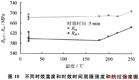 應(yīng)變時(shí)效是鋼經(jīng)過(guò)冷塑性變形后,在室溫長(zhǎng)時(shí)間放置或稍加熱后,其力學(xué)性能發(fā)生變化(通常是屈服強(qiáng)度增高,屈強(qiáng)比提高,并伴有塑性和韌性降低)現(xiàn)象。原因是存在于鋼中的溶質(zhì)組元如C、N原子通過(guò)擴(kuò)散在位錯(cuò)周圍偏聚,形成柯氏(Cottrell)氣團(tuán),使位錯(cuò)運(yùn)動(dòng)變得困難,導(dǎo)致屈服強(qiáng)度升高。圖10為X80鋼管在不同時(shí)效條件下屈服強(qiáng)度和抗拉強(qiáng)度的變化情況。由圖10可見(jiàn),隨著時(shí)效溫度升高和時(shí)效時(shí)間的延長(zhǎng),鋼管的抗拉強(qiáng)度變化不明顯,但屈服強(qiáng)度則明顯上升。在實(shí)際防腐過(guò)程中,時(shí)間一般只有5min左右。而從試驗(yàn)結(jié)果來(lái)看,防腐溫度在200℃以下時(shí),屈服強(qiáng)度沒(méi)有明顯變化。因此可以規(guī)定防腐時(shí)的加熱溫度不宜超討200℃。