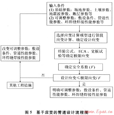 中石油《西氣東輸二線工程關(guān)鍵技術(shù)研究》重大專項(xiàng)設(shè)置課題研究了西二線基于應(yīng)變的設(shè)計(jì)方法并進(jìn)行了抗大變形管線鋼的研究與開(kāi)發(fā)。中石油規(guī)劃設(shè)計(jì)總院和管道設(shè)計(jì)院編制了《西氣東輸二線管道工程強(qiáng)震區(qū)和活動(dòng)斷層區(qū)段埋地管道基于應(yīng)變?cè)O(shè)計(jì)導(dǎo)則》[10~11]?;趹?yīng)變的管道設(shè)計(jì)流程如圖5所示。核心環(huán)節(jié)是設(shè)計(jì)應(yīng)變小于等于極限應(yīng)變/安全系數(shù)。此處的極限應(yīng)變就是鋼管應(yīng)力-應(yīng)變曲線中的屈曲應(yīng)變。它可以直接由鋼管實(shí)物試驗(yàn)測(cè)出,也可由經(jīng)驗(yàn)公式、ECA(Engineer Critical Assessment)、寬板試驗(yàn)等確定。