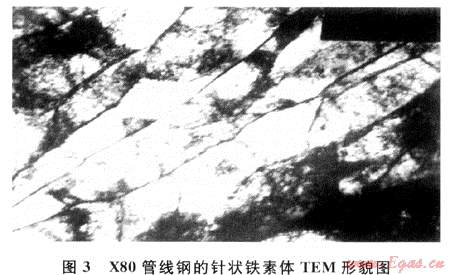 所謂針狀鐵素體型管線鋼,并不是必須100%的針狀鐵素體,而是針狀鐵素體、粒狀貝氏體和少量塊狀鐵素體等的混合組織。對(duì)于這種類型管線鋼的組織目前尚無(wú)統(tǒng)一的術(shù)語(yǔ)。鑒于針狀鐵素體(又稱板條貝氏體鐵素體)和粒狀貝氏體都屬于貝氏體范疇。因此也有人把針狀鐵素體鋼稱為貝氏體鋼。圖3是X80針狀鐵素體型管線鋼TEM(透射電子顯微鏡)形貌。