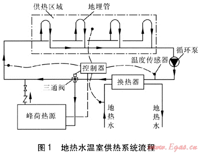 地?zé)崴疁厥夜嵯到y(tǒng)流程(見圖1)由換熱器、地埋管、峰荷熱源、循環(huán)泵、溫度傳感器、控制器、三通閥等組成。換熱器將地?zé)崴c供熱介質(zhì)隔開,防止地?zé)崴畬峁艿赖母g及結(jié)垢。地埋管安裝在溫室內(nèi)地面下,向溫室散熱??刂破髟诓杉覂?nèi)溫度、供熱介質(zhì)供回水溫度和地?zé)崴疁囟葦?shù)據(jù)的基礎(chǔ)上,進(jìn)行分析計算,控制三通閥的啟閉和峰荷熱源工作狀態(tài),調(diào)節(jié)補充熱量,滿足供熱要求。在設(shè)計地?zé)崴疁厥夜嵯到y(tǒng)時,需要掌握的地?zé)峋畢?shù)為:地?zé)崴疁囟?、水量、水位、水質(zhì)狀況。地?zé)崴疁囟?、水量可以確定地?zé)崴淖畲蠊嶝?fù)荷,地?zé)崴挥糜跐撍玫倪x型,水質(zhì)狀況用來判斷地?zé)崴母g結(jié)垢趨勢。