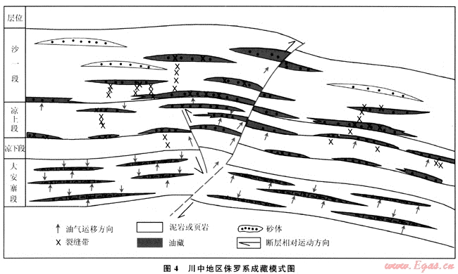 川中地區(qū)侏羅系油藏形成主要受油源區(qū)、斷裂或裂縫及儲(chǔ)集體三要素控制。儲(chǔ)集體是基礎(chǔ),斷裂或裂縫是橋梁。大安寨段及涼高山組生油層生成的油就近運(yùn)移形成自生自儲(chǔ)型油藏。介殼灘或砂體發(fā)育的三角洲前緣、濱淺湖亞相分布帶與構(gòu)造裂縫發(fā)育帶疊加區(qū)是油氣富集區(qū)。涼高山組頁(yè)巖生成的油可直接向覆于其上的沙溪廟底部砂巖排烴而形成“下生上儲(chǔ)”式油藏。涼高山組或大安寨段生成的原油沿?cái)嗔鸭鞍樯牧芽p帶繼續(xù)上移至沙溪廟組底以上的河道砂體或?yàn)I淺湖灘壩而形成次生油藏。成藏模式如圖4所示。