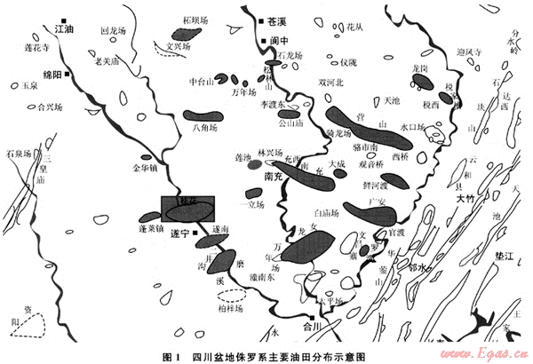 四川盆地雖以產(chǎn)氣為主,但至今仍在盆地內(nèi)發(fā)現(xiàn)了柘壩場(chǎng)、金華鎮(zhèn)、秋林、中臺(tái)山、石龍場(chǎng)、八角場(chǎng)、公山廟、充西-蓮池、桂花、一立場(chǎng)、稅家槽、鮮渡河等油田(圖1)。在四川盆地中部(川中)侏羅系中自下而上發(fā)現(xiàn)了珍珠沖段、東岳廟段、大安寨段、涼高山組、沙溪廟組5個(gè)含油層段,其中大安寨段、涼高山組和沙溪廟組為主力產(chǎn)油層。川西南部和中部在侏羅系地層中發(fā)現(xiàn)了新場(chǎng)、洛帶、平落壩、大興西等氣田,川西北部侏羅系露頭發(fā)現(xiàn)了油砂巖[1]。1950~1960年間在江油海棠鋪構(gòu)造所鉆井至今井口仍有少量原油產(chǎn)出。川東地區(qū)在侏羅系鉆井中也頻見(jiàn)油氣顯示,新5井日產(chǎn)原油36t[2]。川東北渡口河、五寶場(chǎng)地區(qū)于侏羅系上沙溪廟組亦發(fā)現(xiàn)氣藏并投入開(kāi)發(fā)。為此,研究了四川盆地侏羅系的油氣成藏條件。
