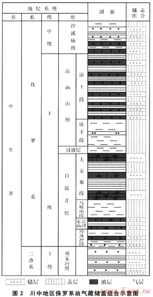 川中地區(qū)侏羅系儲(chǔ)層多層段分布,珍珠沖段砂巖、東岳廟段石灰?guī)r、大安寨段石灰?guī)r、涼高山組砂巖及沙溪廟組砂巖構(gòu)成了重要的產(chǎn)油層。沙溪廟組、蓬萊鎮(zhèn)組是川西南部侏羅系主要?dú)鈱?;川東北地區(qū)目前主要在上沙溪廟組獲得氣藏。