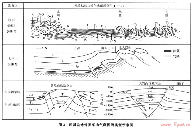 總之,除在龍門(mén)山?jīng)_斷帶、大巴山?jīng)_斷帶及華鎣山?jīng)_斷帶上升盤(pán)中生代和古生代地層遭到強(qiáng)烈剝蝕不具備封蓋和保存條件,逆沖大斷裂下降盤(pán)侏羅系地層上傾方向與具壓性特點(diǎn)的斷裂相接,可構(gòu)成構(gòu)造-巖性圈閉以外,盆內(nèi)大部分地區(qū)都主要以巖性圈閉、構(gòu)造(裂縫)-巖性圈閉為主(圖3)。油氣橫向運(yùn)移受到制約,斷裂及其伴生裂縫成為油氣就近運(yùn)移、就近捕獲的重要通道或載體,裂縫有利于油氣的富集。
