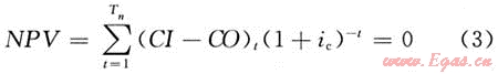 依據(jù)技術(shù)經(jīng)濟(jì)評價(jià)盈虧平衡原理,采用現(xiàn)值法,將投入和產(chǎn)出均折算為評價(jià)起始年的累計(jì)凈現(xiàn)值(NPV)為零作為極限,基本公式如下: