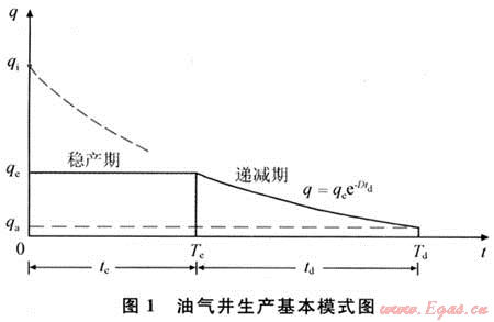 油氣井開采一般都要求有一段時間的穩(wěn)產(chǎn)期(Te),然后再進(jìn)入遞減階段生產(chǎn)(圖1),而穩(wěn)產(chǎn)期的平均日產(chǎn)量(qe),就是本文所指的儲量起算標(biāo)準(zhǔn)產(chǎn)量。