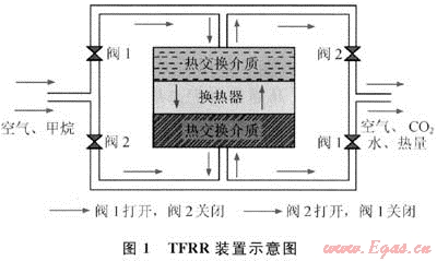 TFRR是由美國Sequa公司和瑞典ADTEC研制開發(fā)的(圖1)。由圖1可見,反應器的兩端是石英砂或者陶瓷顆粒構(gòu)成的熱交換介質(zhì),熱交換介質(zhì)中心裝有電熱元件,反應器周圍有較好的絕熱層。基本原理是氣體與熱交換介質(zhì)在反應區(qū)進行熱交換,氣體受熱達到燃燒所需要的溫度,發(fā)生氧化反應,放出熱量[11~12]。