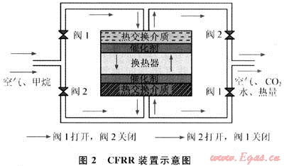 開始運行時,電熱元件對熱交換介質(zhì)進行預熱,使之達到反應所需要的溫度。一個循環(huán)包括兩次風流轉(zhuǎn)向,每一次轉(zhuǎn)向稱為一個半循環(huán)。在第一個半循環(huán)中,甲烷和空氣的混合物以常溫通入反應器,閥1打開,閥2關閉,風流從反應器頂部流向底部,當空氣和甲烷的混合物到達熱交換介質(zhì)時發(fā)生氧化反應,放出熱量。產(chǎn)生的熱量及反應產(chǎn)物持續(xù)通過反應器的出口,出口處的熱交換介質(zhì)不斷吸熱,從而溫度不斷升高。而入風側(cè)因風流以常溫通過,熱交換介質(zhì)不斷被冷卻,當冷卻到一定溫度時,反應器自動轉(zhuǎn)換風流方向,進入第二個半循環(huán)。風流從高溫側(cè)進入,并吸收熱交換介質(zhì)的熱量,從而達到自燃溫度。反應生成的熱量,一部分被熱交換器吸收,另一部分用于補償熱損失,從而往復循環(huán)。