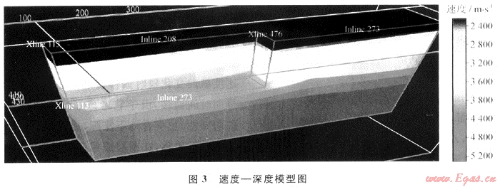 采用均方根速度轉(zhuǎn)換方法估算層速度與相干反演相結(jié)合的方法進行層速度模型的建立。通過疊前時間偏移迭代后,均方根速度模型比較準確,在一定程度上符合地質(zhì)變化規(guī)律。對于水平層狀或單傾的介質(zhì),均方根速度模型轉(zhuǎn)換的方法能得到較好的初始模型,并通過層析成像模型優(yōu)化能得到精確的速度模型。對于地層傾角變化較大、速度不均一的復(fù)雜斷塊,簡單的速度轉(zhuǎn)換方法不能合理地描述速度結(jié)構(gòu)。采用相干反演法與均方根速度轉(zhuǎn)換法聯(lián)合建立層速度模型,相互驗證速度的合理性精度更高。通過分析沿層剩余速度,利用三維層析成像技術(shù)修改層速度模型優(yōu)化地質(zhì)模型,建立最優(yōu)速度-深度模型剛(圖3)。