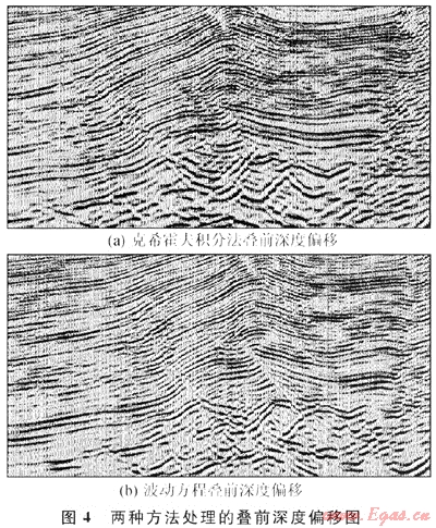 三維疊前深度偏移方法主要采用克希霍夫積分法,優(yōu)點是計算效率高,對野外觀測無任何限制適應(yīng)能力強,且能較好的適應(yīng)大傾角偏移,具有抗假頻能力;缺點是射線多路徑問題、焦散、振幅保真處理問題和分辨率低等。研究人員通過兩種途徑來解決不足:①對現(xiàn)有的克希霍夫法在旅行時計算和偏移方法方面進行改進,如從首波旅行時計算向基于波前重建的旅行時計算,其中考慮了多個射線,并且是利用體波旅行時、相對保幅處理和基于模型的孔經(jīng)定義等,改進后的成像結(jié)果其構(gòu)造細節(jié)更加清楚可靠;②發(fā)展新的偏移方法,借助于高性能的PC-CLUSTER微機集群,采用波動方程偏移方法,其成像結(jié)果更好。圖4可看出波動方程疊前深度偏移在深層斷點歸位準確、振幅頻率保持較好,成像精度更高[6]。