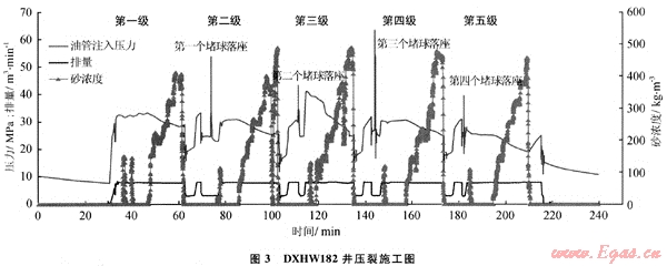 2009年對(duì)DX1424井采用小階梯類(lèi)似線(xiàn)形加砂壓裂,控制前置液比例50%以上,排量確定為4m3/min左右,加砂規(guī)模介于2.0~3.0m3/min,壓裂后日產(chǎn)氣29.0×104m3。