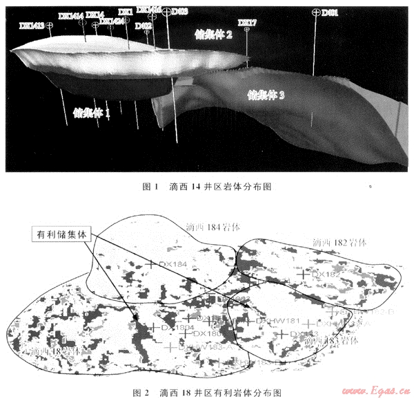 滴西14井區(qū)為多錐型復(fù)合火山機(jī)構(gòu),以爆發(fā)相為主,經(jīng)歷多期次噴發(fā)及水流搬運(yùn)沉積,形成3個(gè)火山巖體(圖1),對(duì)應(yīng)3個(gè)儲(chǔ)集體,具有“兩弱一強(qiáng)”的地震反射特征,有利儲(chǔ)層為爆發(fā)相的火山角礫巖儲(chǔ)層(儲(chǔ)集體1和儲(chǔ)集體2)。
