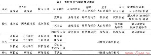 按照“成分+結(jié)構(gòu)、構(gòu)造+成因”的分類(lèi)原則[1],對(duì)克拉美麗氣田石炭系火山巖巖石進(jìn)行了分類(lèi)及命名,共分為7大類(lèi)、28小類(lèi)、上百種巖石類(lèi)型(見(jiàn)表1)。
