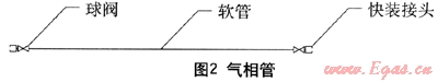 圖2為氣相管路,主要實(shí)現(xiàn)事故槽車(chē)、卸車(chē)壓縮機(jī)和搶險(xiǎn)槽車(chē)的連接,主要由球閥、軟管和快裝接頭組成。由于設(shè)備及槽車(chē)所用快裝接頭皆為陽(yáng)接頭,故軟管上所配接頭采用陰接頭。