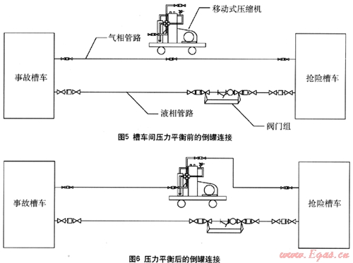 (3) 當(dāng)壓縮機(jī)上入口壓力降低到2.8bar(294Pa)以下時(shí)候關(guān)閉事故槽車(chē)氣相出口和搶險(xiǎn)槽車(chē)氣相出口,同時(shí)關(guān)閉柴油發(fā)動(dòng)機(jī)。關(guān)閉事故槽車(chē)的液相口,同時(shí)各管段上閥門(mén)關(guān)閉后拆卸,倒罐流程到此結(jié)束??筛鶕?jù)現(xiàn)場(chǎng)實(shí)際情況安排后續(xù)的氮?dú)庵脫Q和吊裝拖運(yùn)。