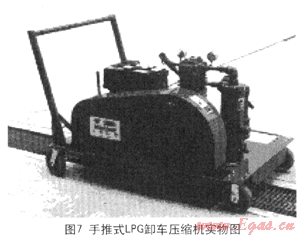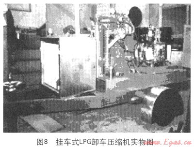 圖7手推式LPG卸車(chē)壓縮機(jī)可以實(shí)現(xiàn)在小片區(qū)域的人工改變位置,從而為小片區(qū)域的多個(gè)卸車(chē)點(diǎn)進(jìn)行卸車(chē);圖8為掛車(chē)式LPG卸車(chē)壓縮機(jī),其中配備了更加齊全的附加設(shè)備,從而實(shí)現(xiàn)了大片區(qū)域的不同地點(diǎn)的卸車(chē)需求。目前該種移動(dòng)式應(yīng)急卸車(chē)設(shè)備在香港加德士石油公司、香港加德士石油公司、香港殼牌有限公司及汕頭加德士海洋燃?xì)庥邢薰九鋫涫褂茫瑧?yīng)該算作是用于搶險(xiǎn)卸車(chē)的雛形狀態(tài)。